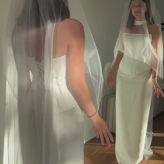 She features a clean-lined, square neckline and sculpted bodice designed to support and flatter. Her floor-length crepe skirt drapes effortlessly from the waist, offering fluid movement and timeless simplicity. The Audrey Gown is available with a lace-up back or hidden zip for a seamless fit that’s all yours.