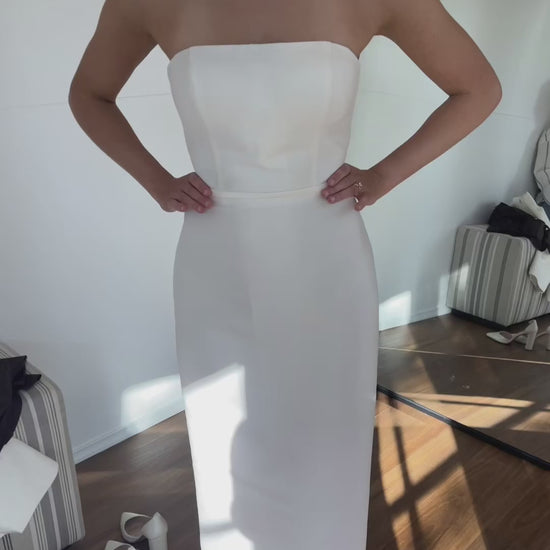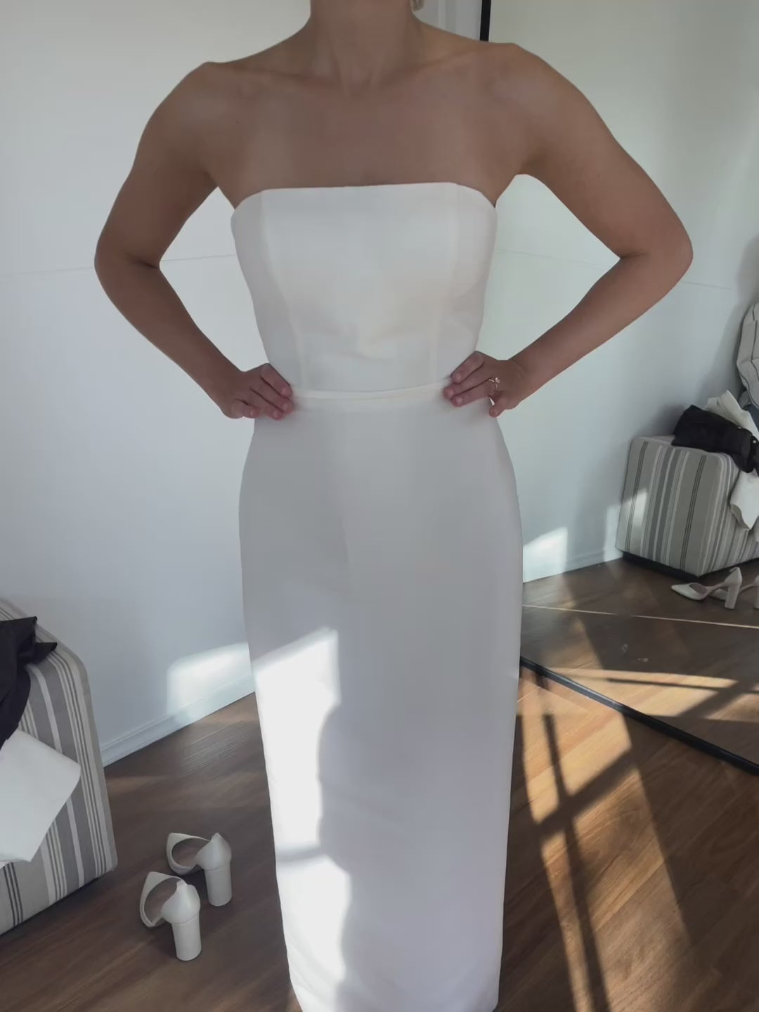 Carly is where it all began. She radiates classic elegance with a structured square neckline and delicate straps. Her figure-hugging silhouette flows seamlessly into a simple pencil skirt, creating a look that is both sophisticated and timeless.