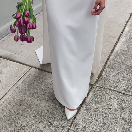Jessie: Structured and sculpted. Made from premium crepe (pictured) or mikado, her 2 piece corset and skirt gown is timeless and elegant. With her ever-so flattering cats eye top, accentuating the décolletage with a touch of old school luxe, while her slim pencil skirt brings the shape.