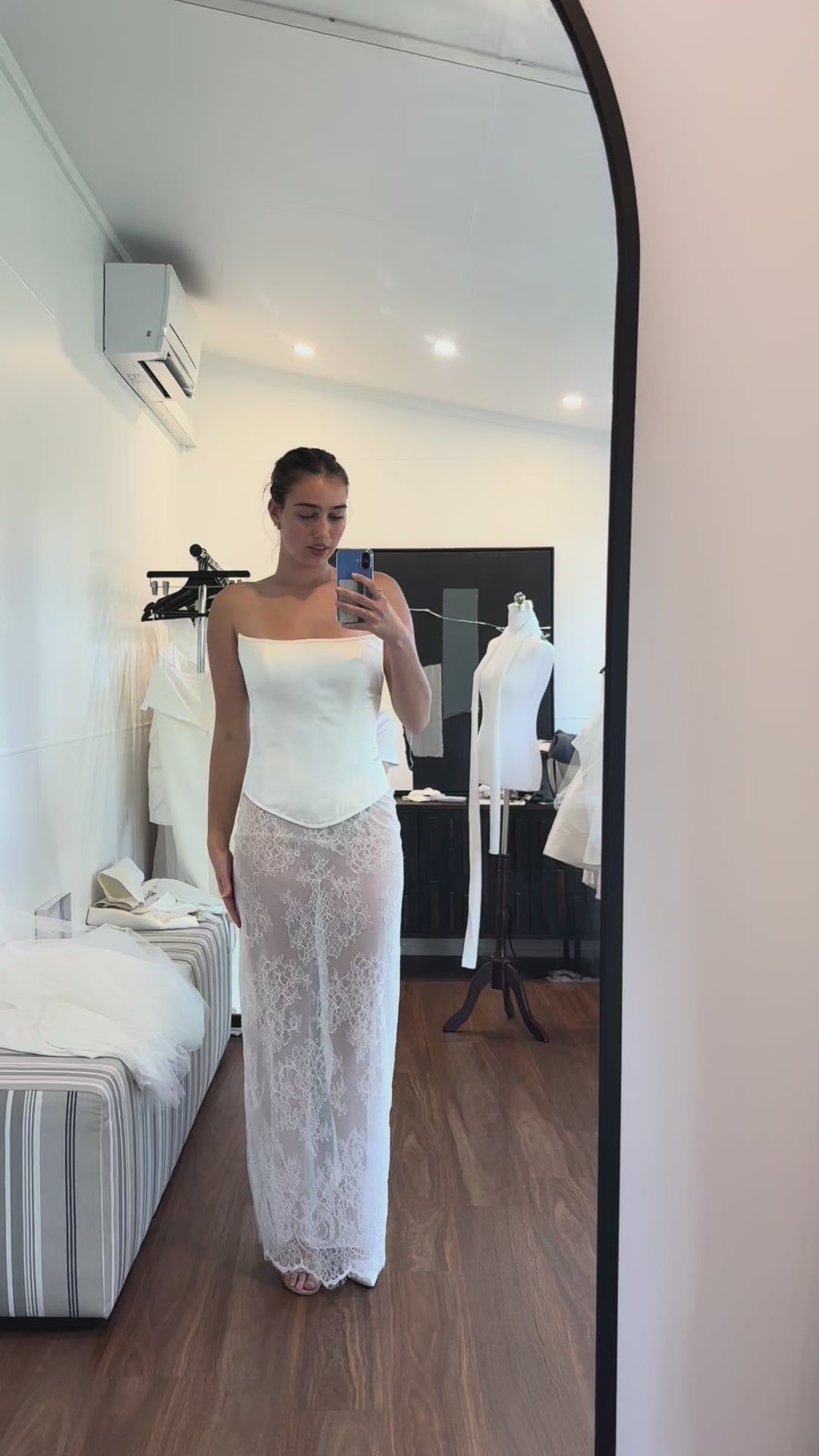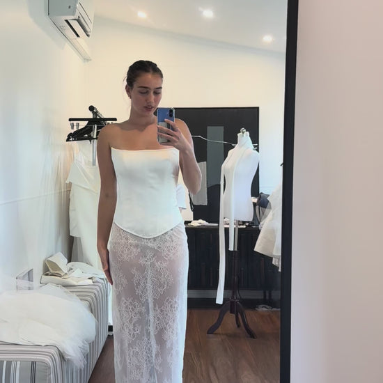 Choose your perfect corset (Sarah, Meg, Jessie or Audrey) from our curated collection of styles - whether you prefer delicate satin, clean crepe lines, or mikado to pair with this stunning lace skirt.