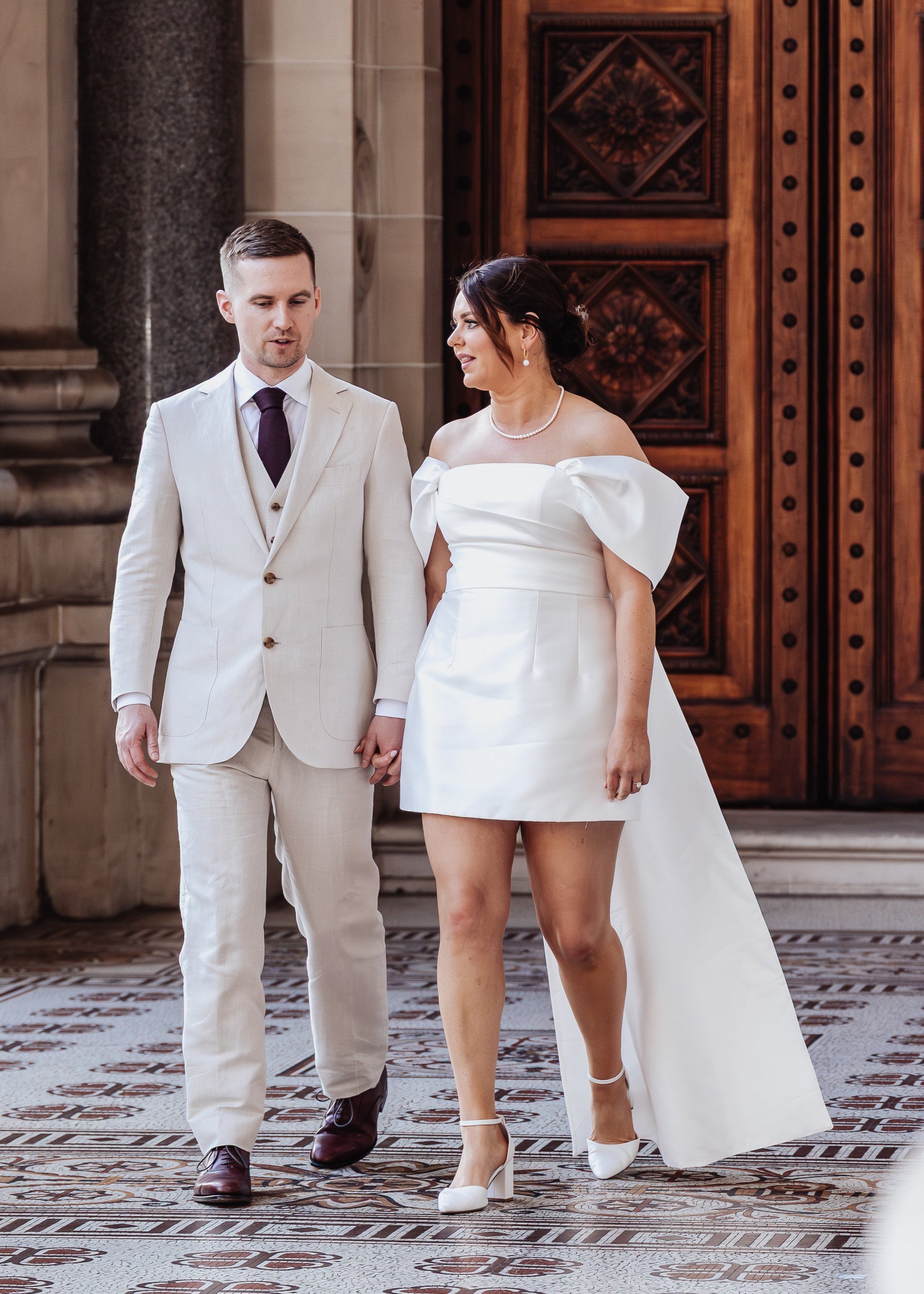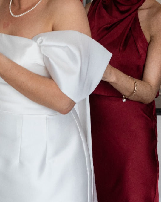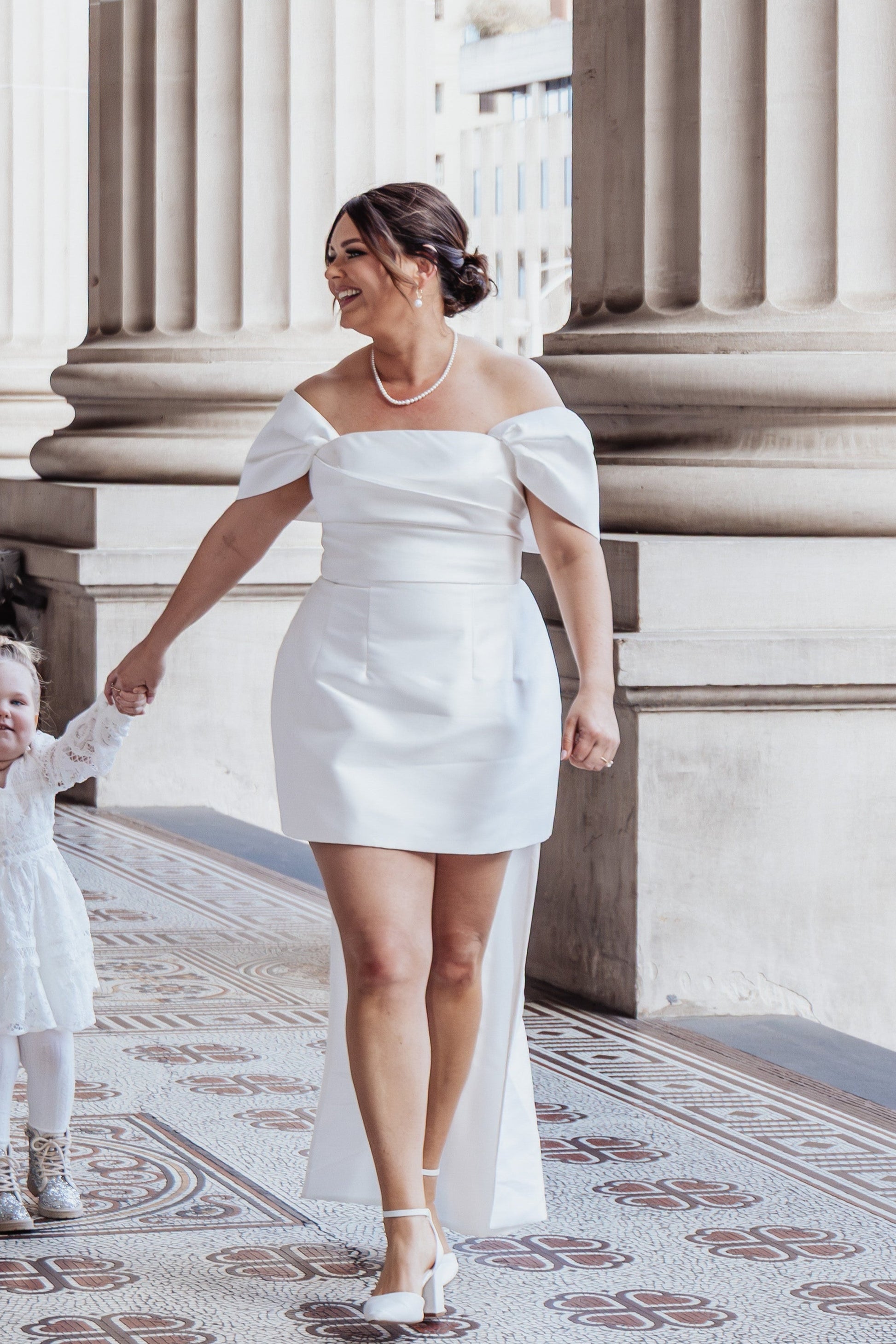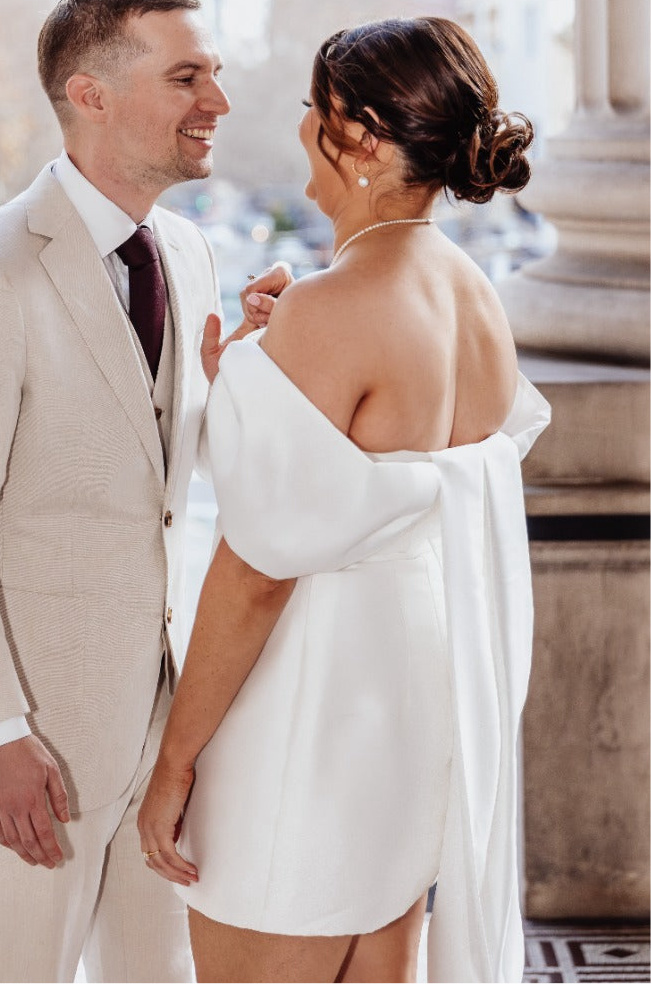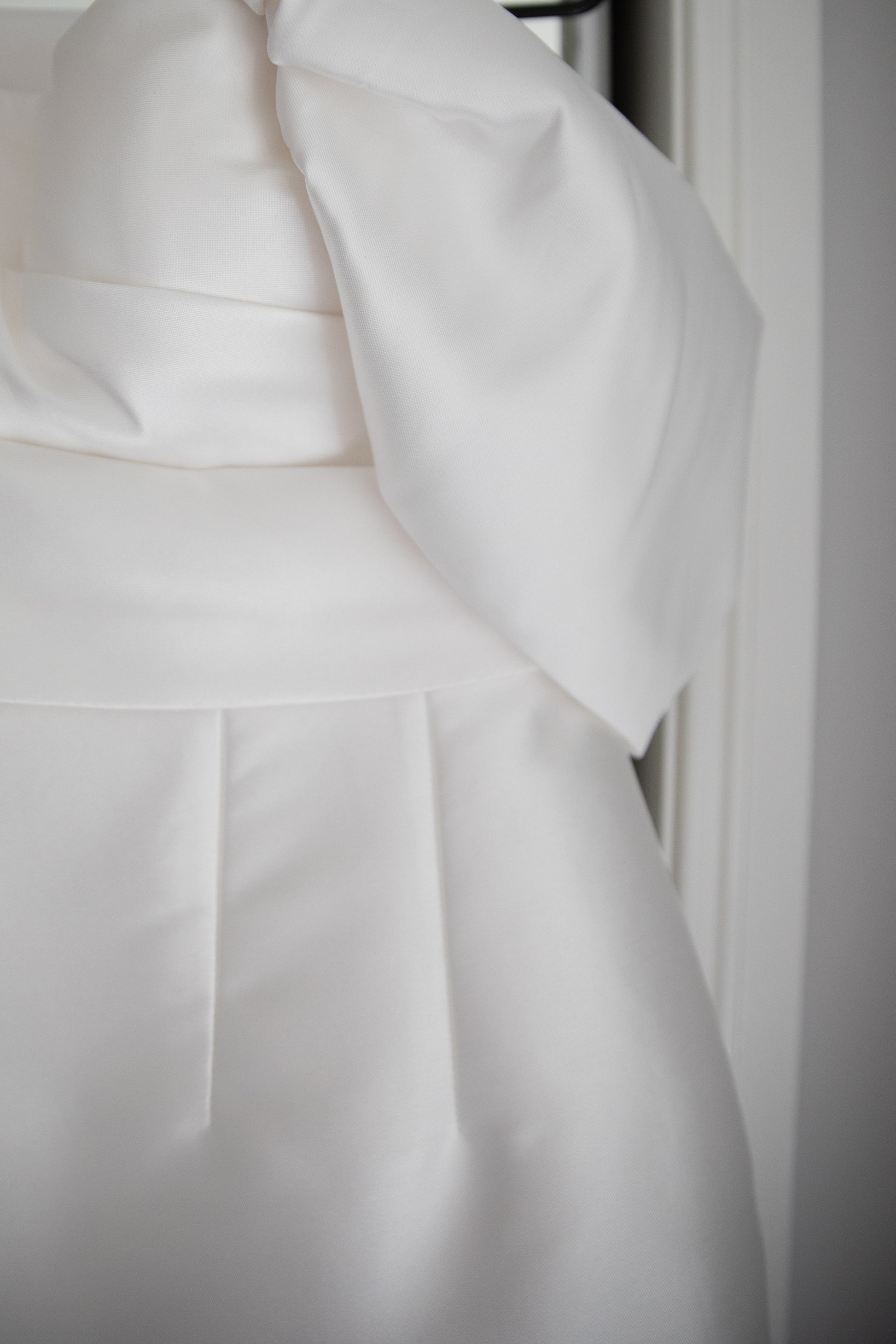 Our Lucy 3 piece dress embodies effortless elegance with her clean, modern silhouette and versatile design elements. Her sleek mikado fabric creates a luxurious foundation that drapes beautifully while maintaining structure and shape throughout your special day.