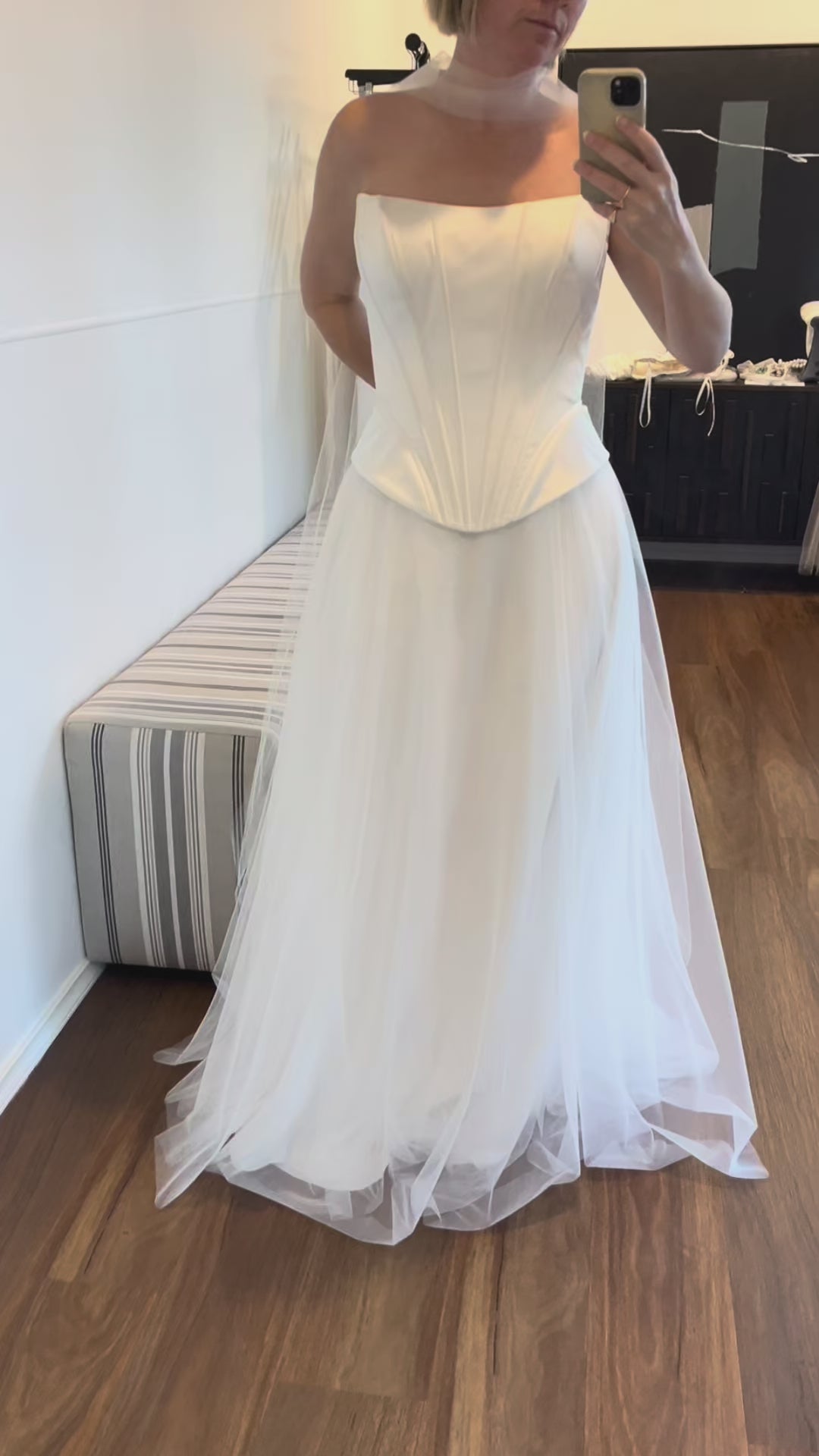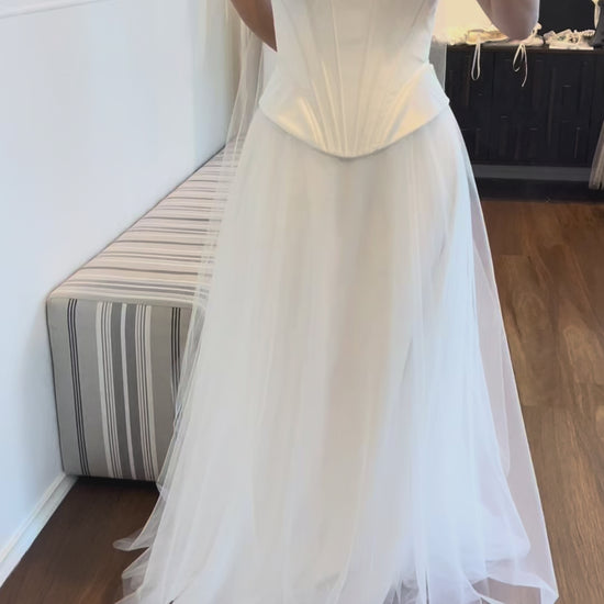 Step into your fairytale moment with this stunning combination of structured sophistication and dreamy femininity. The gown features a beautifully crafted corset bodice (pictured here is our Sarah corset) that cinches and flatters your silhouette, paired with a flowing A-line tulle skirt that moves like poetry with every step.